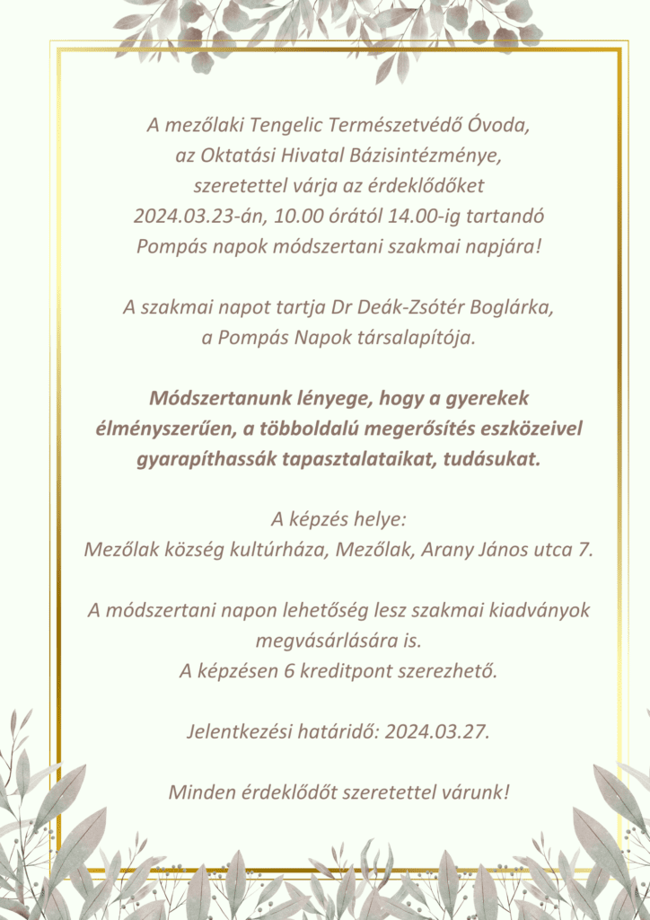 A mezőlaki Tengelic Természetvédő Óvoda, az Oktatási Hivatal Bázisintézménye, szeretettel várja az érdeklődőket, 2024.03.23-án, 10.00 órától 14.00-ig tartandó Pompás napok módszertani szakmai napjára! A szakmai napot tartja Dr Deák-Zsótér Boglárka a Pompás Napok alapítója.