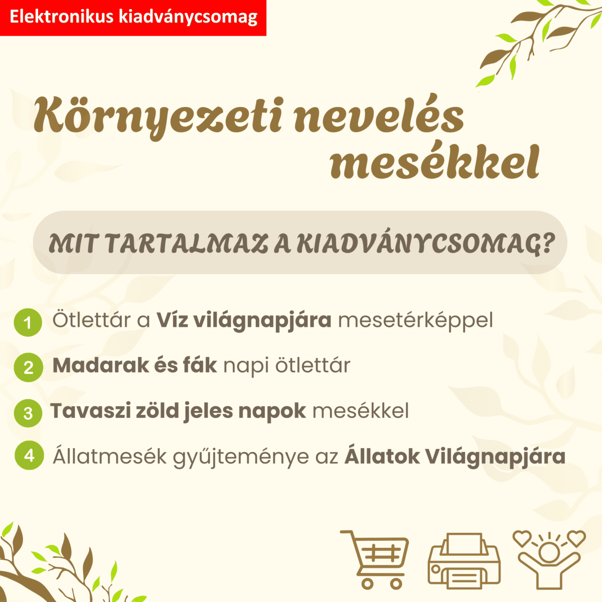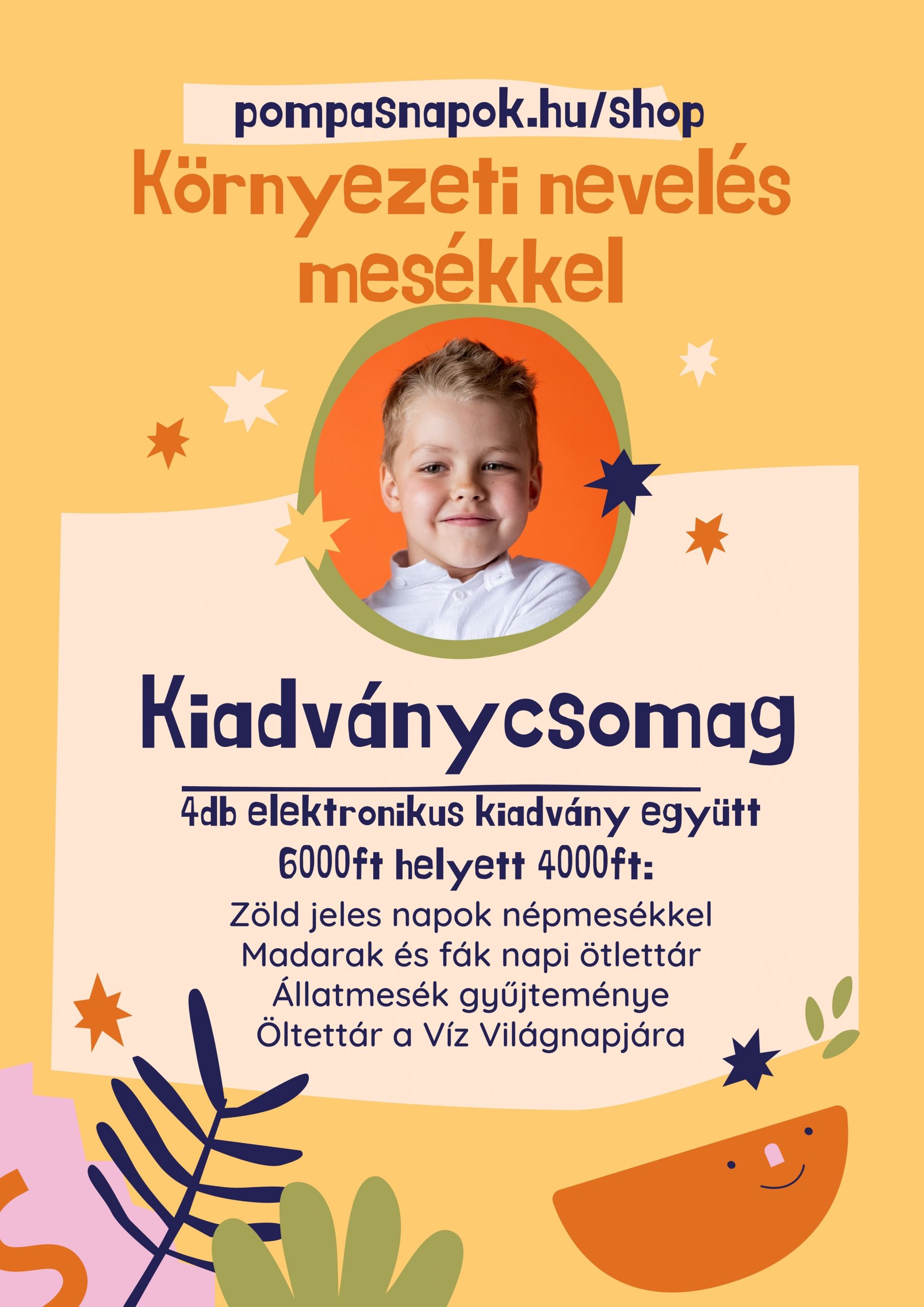 A kiadványcsomag 4db elektronikus kiadványt tartalmaz: Ötlettár a Víz világnapjára mesetérképpel, Tavaszi zöld jeles napok mesékkel, Állatmesék gyűjteménye az Állatok Világnapjára, Madarak és fák napi ötlettár.