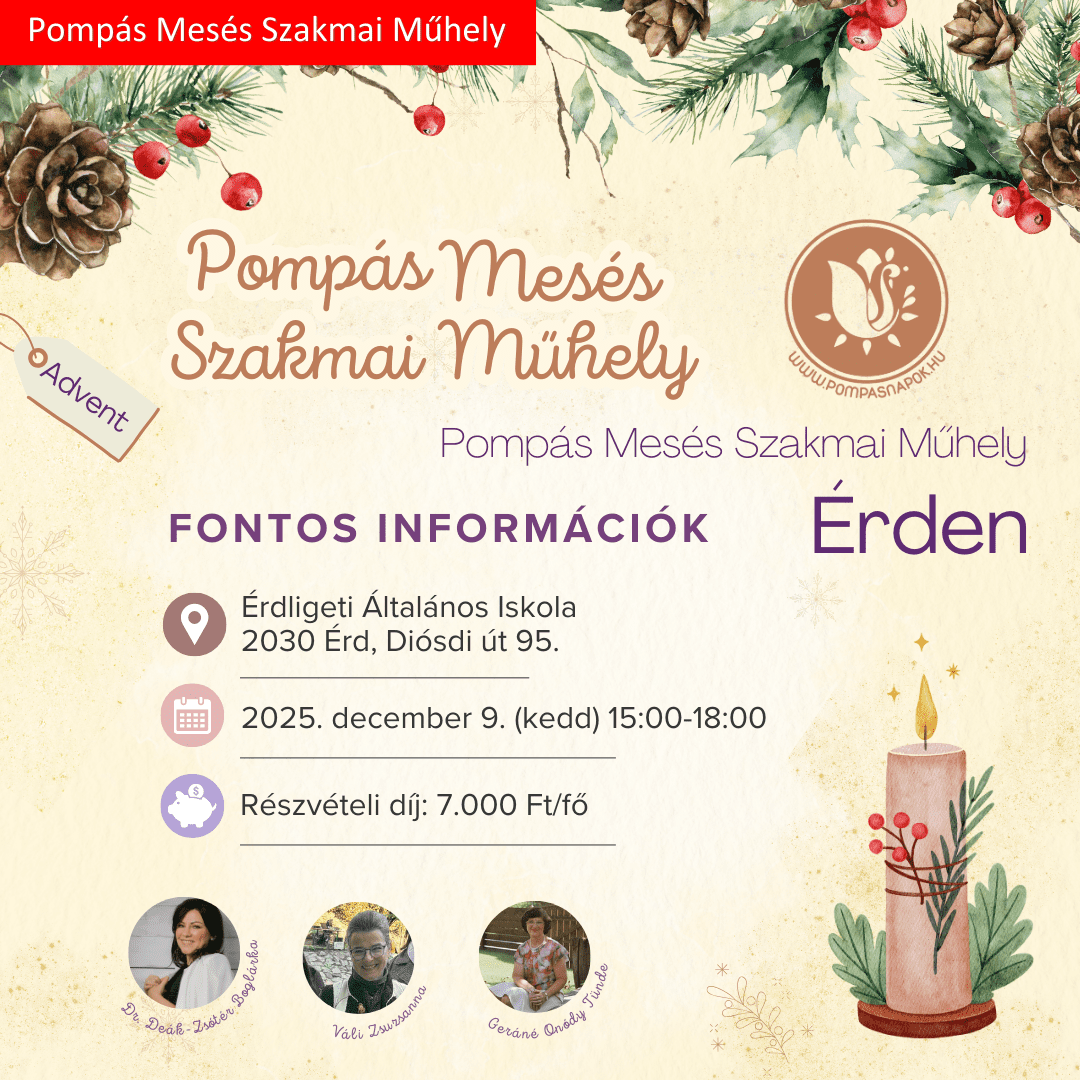 Szeretettel várunk Pompás Mesés Szakmai Műhelyünkre, ahol három sajátélményű mesefeldolgozás, közös játékok, tárgyalkotás és szakmai beszélgetés vár Rád. A szakmai műhely a téli–adventi ünnepkörhöz kapcsolódik.